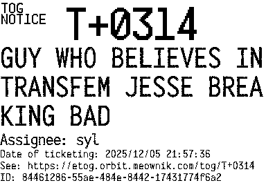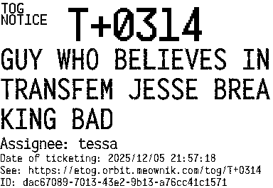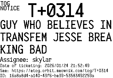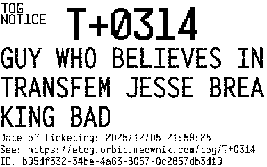 Orbit eTOG Listing Service: T+0314 GUY WHO BELIEVES IN TRANSFEM JESSE BREAKING BAD