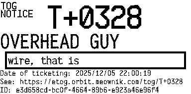 Orbit eTOG Listing Service: T+0328 OVERHEAD GUY