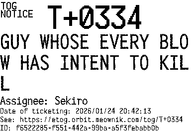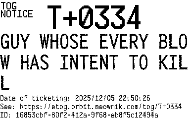Orbit eTOG Listing Service: T+0334 GUY WHOSE EVERY BLOW HAS INTENT TO KILL