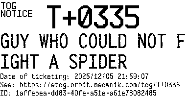 Orbit eTOG Listing Service: T+0335 GUY WHO COULD NOT FIGHT A SPIDER