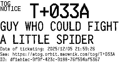 Orbit eTOG Listing Service: T+033A GUY WHO COULD FIGHT A LITTLE SPIDER