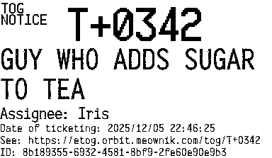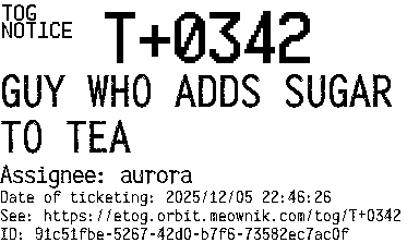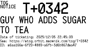 Orbit eTOG Listing Service: T+0342 GUY WHO ADDS SUGAR TO TEA