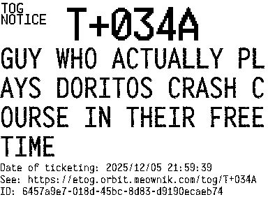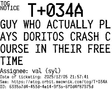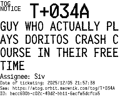 Orbit eTOG Listing Service: T+034A GUY WHO ACTUALLY PLAYS DORITOS CRASH COURSE IN THEIR FREE TIME