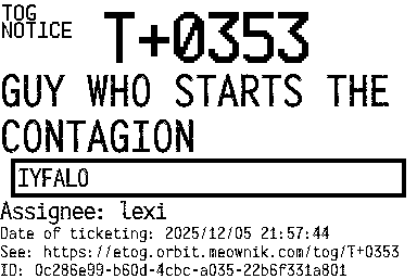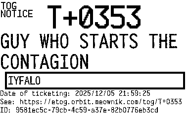 Orbit eTOG Listing Service: T+0353 GUY WHO STARTS THE CONTAGION