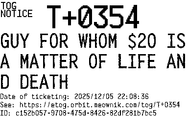 Orbit eTOG Listing Service: T+0354 GUY FOR WHOM $20 IS A MATTER OF LIFE AND DEATH