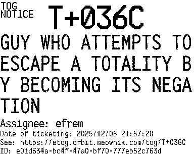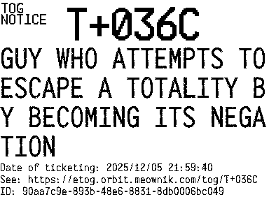 Orbit eTOG Listing Service: T+036C GUY WHO ATTEMPTS TO ESCAPE A TOTALITY BY BECOMING ITS NEGATION