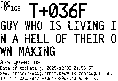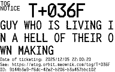 Orbit eTOG Listing Service: T+036F GUY WHO IS LIVING IN A HELL OF THEIR OWN MAKING