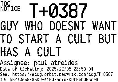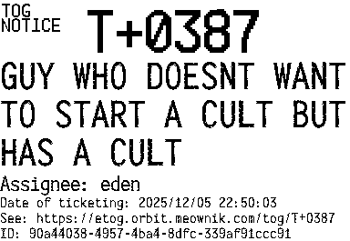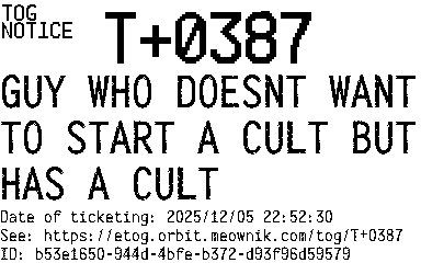 Orbit eTOG Listing Service: T+0387 GUY WHO DOESNT WANT TO START A CULT BUT HAS A CULT