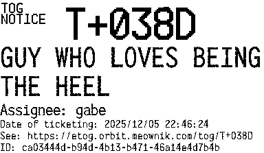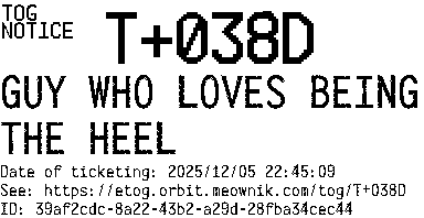 Orbit eTOG Listing Service: T+038D GUY WHO LOVES BEING THE HEEL