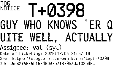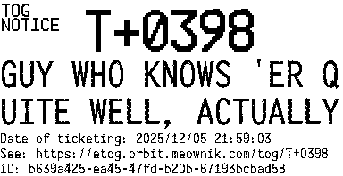 Orbit eTOG Listing Service: T+0398 GUY WHO KNOWS 'ER QUITE WELL, ACTUALLY
