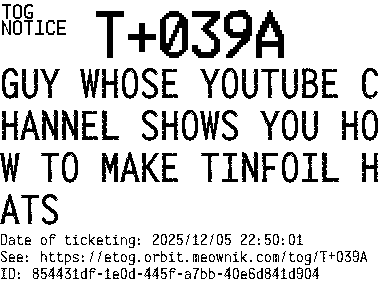 Orbit eTOG Listing Service: T+039A GUY WHOSE YOUTUBE CHANNEL SHOWS YOU HOW TO MAKE TINFOIL HATS