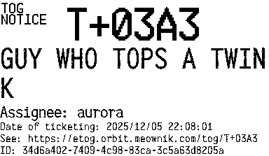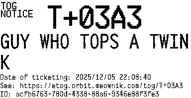 Orbit eTOG Listing Service: T+03A3 GUY WHO TOPS A TWINK