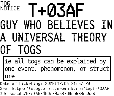 Orbit eTOG Listing Service: T+03AF GUY WHO BELIEVES IN A UNIVERSAL THEORY OF TOGS