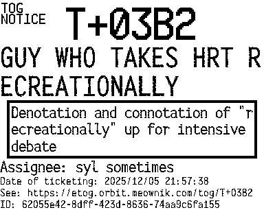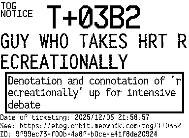 Orbit eTOG Listing Service: T+03B2 GUY WHO TAKES HRT RECREATIONALLY
