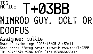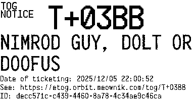 Orbit eTOG Listing Service: T+03BB NIMROD GUY, DOLT OR DOOFUS