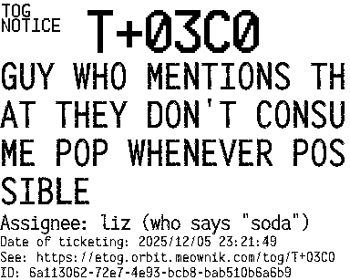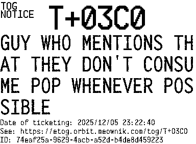 Orbit eTOG Listing Service: T+03C0 GUY WHO MENTIONS THAT THEY DON'T CONSUME POP WHENEVER POSSIBLE