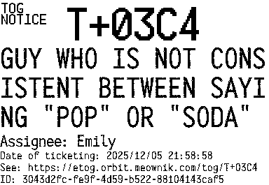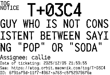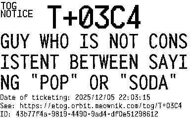 Orbit eTOG Listing Service: T+03C4 GUY WHO IS NOT CONSISTENT BETWEEN SAYING "POP" OR "SODA"