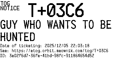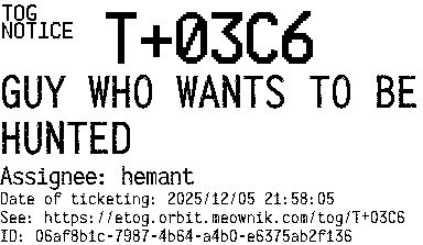 Orbit eTOG Listing Service: T+03C6 GUY WHO WANTS TO BE HUNTED
