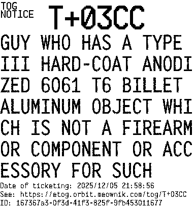 Orbit eTOG Listing Service: T+03CC GUY WHO HAS A TYPE III HARD-COAT ANODIZED 6061 T6 BILLET ALUMINUM OBJECT WHICH IS NOT A FIREARM OR COMPONENT OR ACCESSORY FOR SUCH