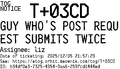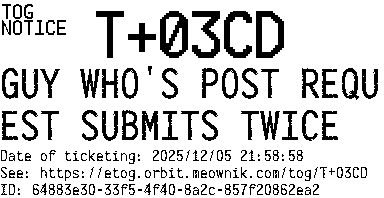 Orbit eTOG Listing Service: T+03CD GUY WHO'S POST REQUEST SUBMITS TWICE