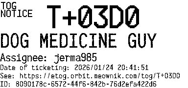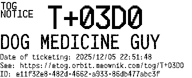 Orbit eTOG Listing Service: T+03D0 DOG MEDICINE GUY