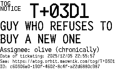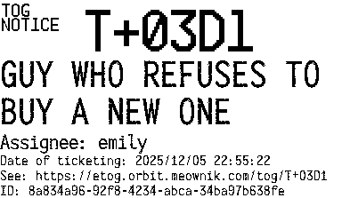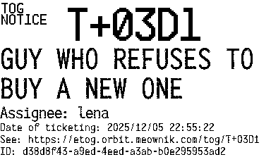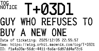 Orbit eTOG Listing Service: T+03D1 GUY WHO REFUSES TO BUY A NEW ONE