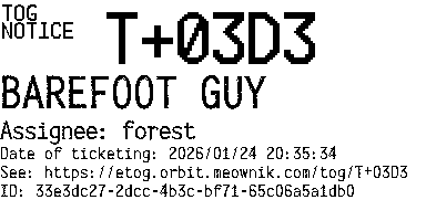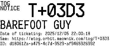 Orbit eTOG Listing Service: T+03D3 BAREFOOT GUY