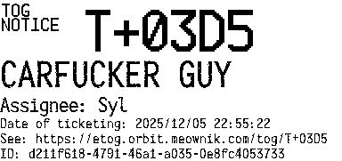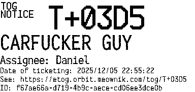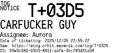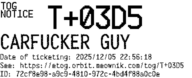 Orbit eTOG Listing Service: T+03D5 CARFUCKER GUY