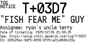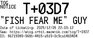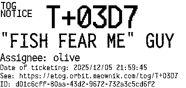 Orbit eTOG Listing Service: T+03D7 "FISH FEAR ME" GUY