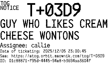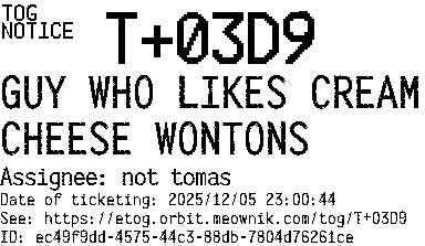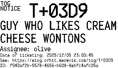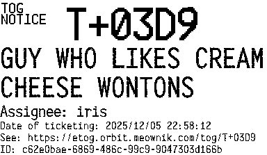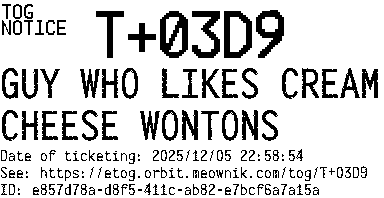 Orbit eTOG Listing Service: T+03D9 GUY WHO LIKES CREAM CHEESE WONTONS