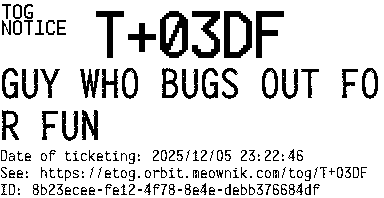 Orbit eTOG Listing Service: T+03DF GUY WHO BUGS OUT FOR FUN