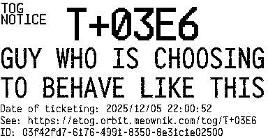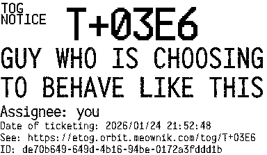 Orbit eTOG Listing Service: T+03E6 GUY WHO IS CHOOSING TO BEHAVE LIKE THIS