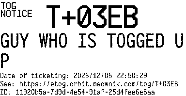 Orbit eTOG Listing Service: T+03EB GUY WHO IS TOGGED UP