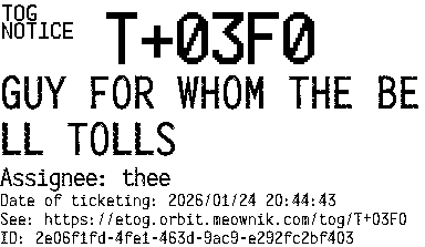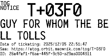 Orbit eTOG Listing Service: T+03F0 GUY FOR WHOM THE BELL TOLLS