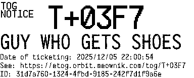 Orbit eTOG Listing Service: T+03F7 GUY WHO GETS SHOES
