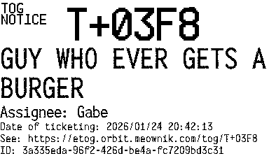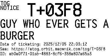 Orbit eTOG Listing Service: T+03F8 GUY WHO EVER GETS A BURGER