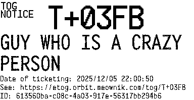 Orbit eTOG Listing Service: T+03FB GUY WHO IS A CRAZY PERSON