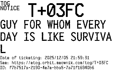 Orbit eTOG Listing Service: T+03FC GUY FOR WHOM EVERY DAY IS LIKE SURVIVAL