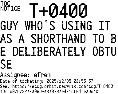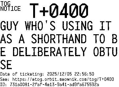 Orbit eTOG Listing Service: T+0400 GUY WHO'S USING IT AS A SHORTHAND TO BE DELIBERATELY OBTUSE