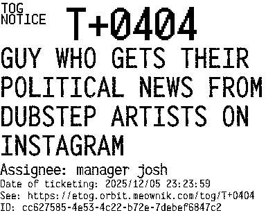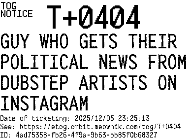 Orbit eTOG Listing Service: T+0404 GUY WHO GETS THEIR POLITICAL NEWS FROM DUBSTEP ARTISTS ON INSTAGRAM