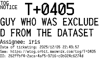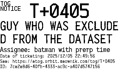 Orbit eTOG Listing Service: T+0405 GUY WHO WAS EXCLUDED FROM THE DATASET