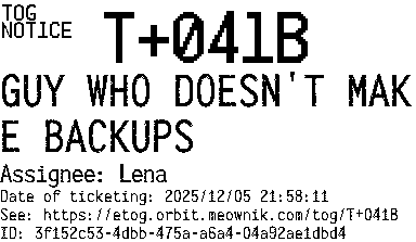 Orbit eTOG Listing Service: T+041B GUY WHO DOESN'T MAKE BACKUPS