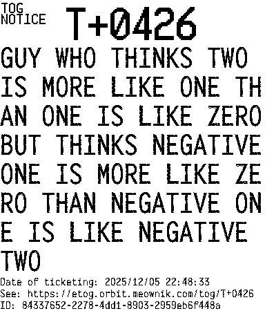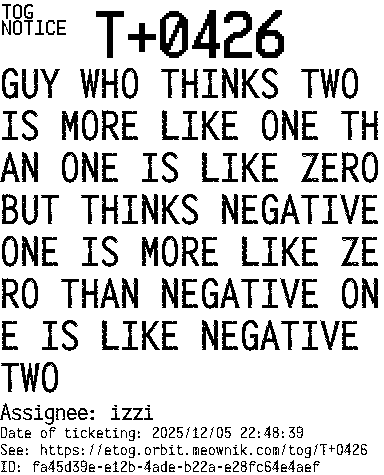 Orbit eTOG Listing Service: T+0426 GUY WHO THINKS TWO IS MORE LIKE ONE THAN ONE IS LIKE ZERO BUT THINKS NEGATIVE ONE IS MORE LIKE ZERO THAN NEGATIVE ONE IS LIKE NEGATIVE TWO