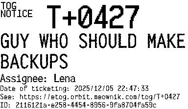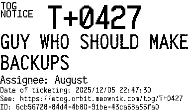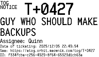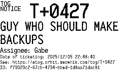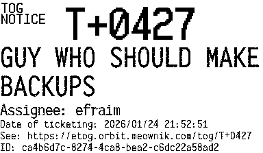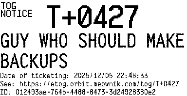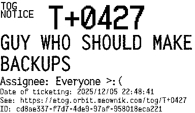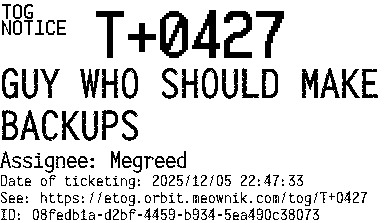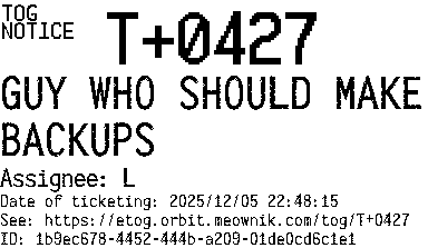 Orbit eTOG Listing Service: T+0427 GUY WHO SHOULD MAKE BACKUPS