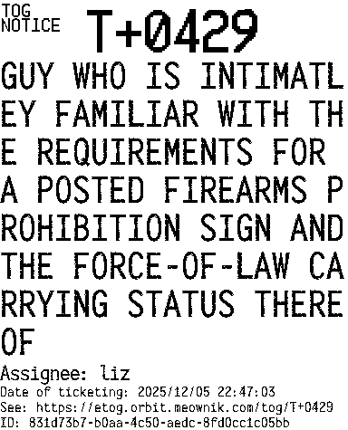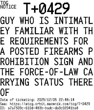 Orbit eTOG Listing Service: T+0429 GUY WHO IS INTIMATLEY FAMILIAR WITH THE REQUIREMENTS FOR A POSTED FIREARMS PROHIBITION SIGN AND THE FORCE-OF-LAW CARRYING STATUS THEREOF