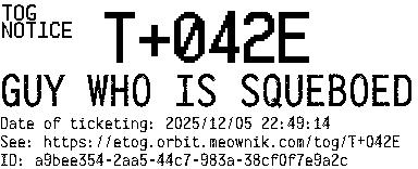 Orbit eTOG Listing Service: T+042E GUY WHO IS SQUEBOED