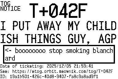 Orbit eTOG Listing Service: T+042F I PUT AWAY MY CHILDISH THINGS GUY, AGP