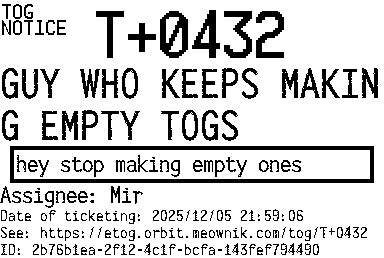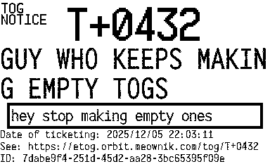 Orbit eTOG Listing Service: T+0432 GUY WHO KEEPS MAKING EMPTY TOGS