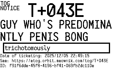 Orbit eTOG Listing Service: T+043E GUY WHO'S PREDOMINANTLY PENIS BONG