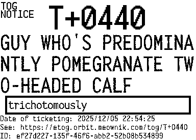 Orbit eTOG Listing Service: T+0440 GUY WHO'S PREDOMINANTLY POMEGRANATE TWO-HEADED CALF